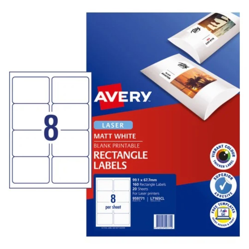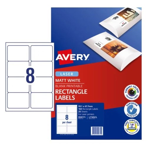 AVERY PRINTABLE LABELS L7165CL 99.1 X 67.7MM RECTANGLE PHOTO MATTE WHITE 8UP 160 LABELS