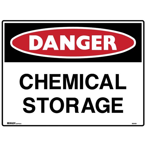BRADY DANGER SIGN CHEMICAL STORAGE 600W X 450MMH POLYPROPYLENE WHITE/RED/BLACK