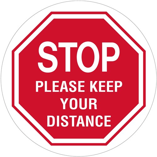 Wording: Stop Please Keep Your Distance. Self-adhesive walk-on floor sign designed to bond to many different surfaces. Clear textured overlaminate protects warning message. Suitable for heavy traffic areas or wall mounting applications where graffiti or heavy wash downs are a problem. Size:440mm Diameter. Suitable for internal use. Size: 440mm diameter.