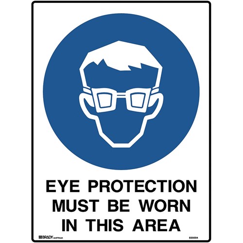 Wording: Eye Protection Must Be Worn In This Area. Material: Polypropylene. Mandatory signs specify an instruction that must be carried out. Complies with AS 1319. Available in various materials and sizes. Size: 450W x 600mmH.