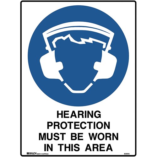 Wording: Hearing Protection Must Be Worn In This Area. Material: Metal. Mandatory signs specify an instruction that must be carried out. Complies with AS 1319. Available in various materials and sizes. Size: 450W x 600mmH.