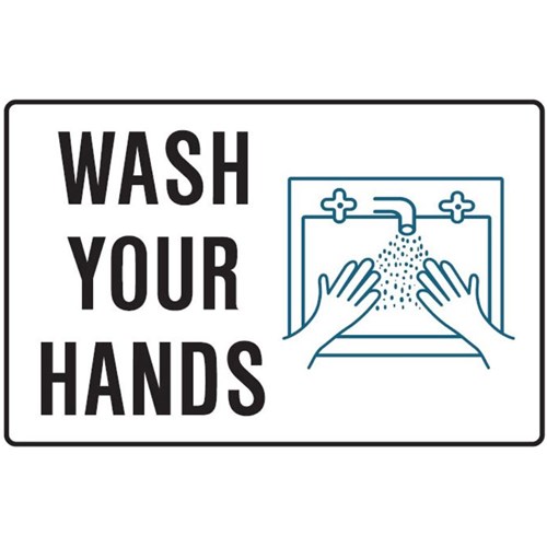 White sign with black writing and blue pictogram. Wording: Wash Your Hands. Material: Metal. Size: 300W x 225mmH.