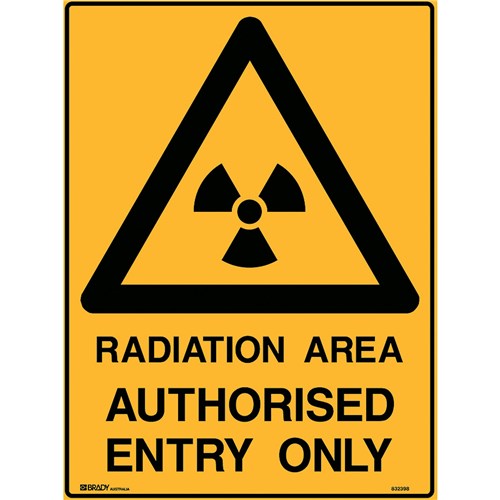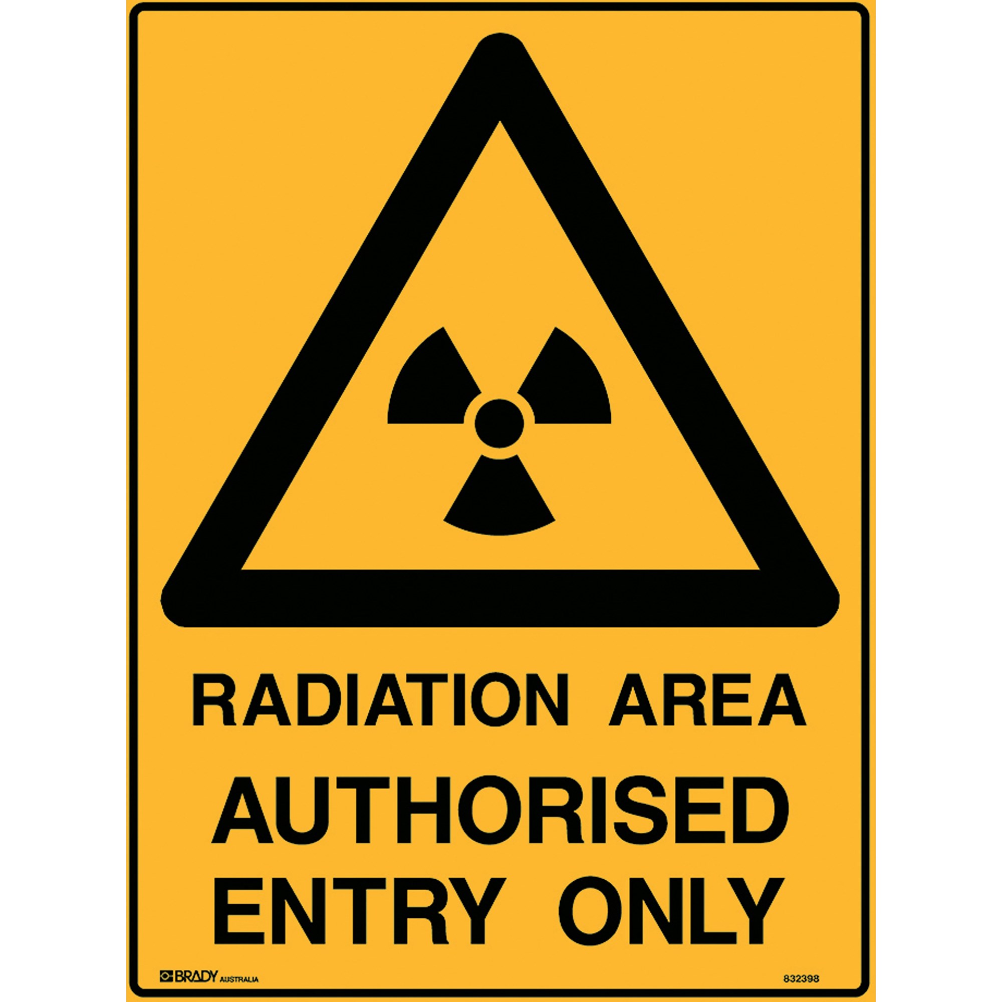 BRADY WARNING SAFETY SIGN RADIATION HAZARD AUTH ENTRY 450WX600MMH METAL YELLOW/BLACK