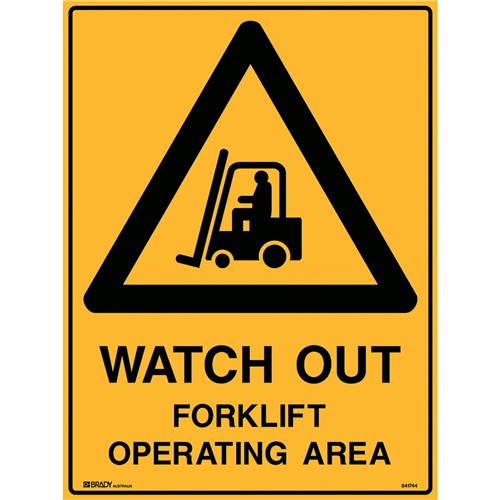 BRADY WARNING SAFETY SIGN WATCH OUT FORKLIFT OPERATING AREA 450WX600MMH METAL YELLOW