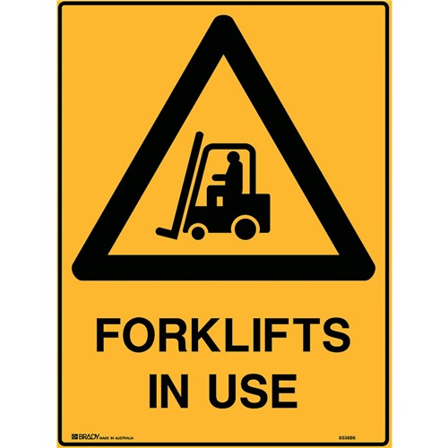 BRADY WARNING SIGN FORKLIFTS IN USE 450W X 600MMH POLYPROPYLENE YELLOW AND BLACK