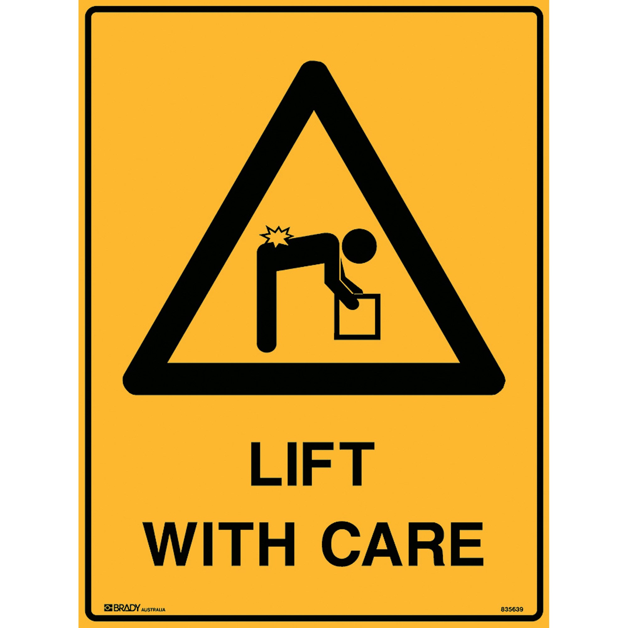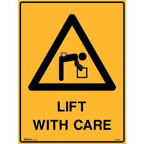 BRADY WARNING SIGN LIFT WITH CARE 450W X 600MMH METAL YELLOW AND BLACK