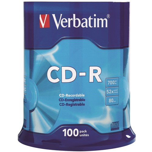 VERBATIM RECORDABLE CD-R 80MIN 700MB 52X SPINDLE PACK OF 100