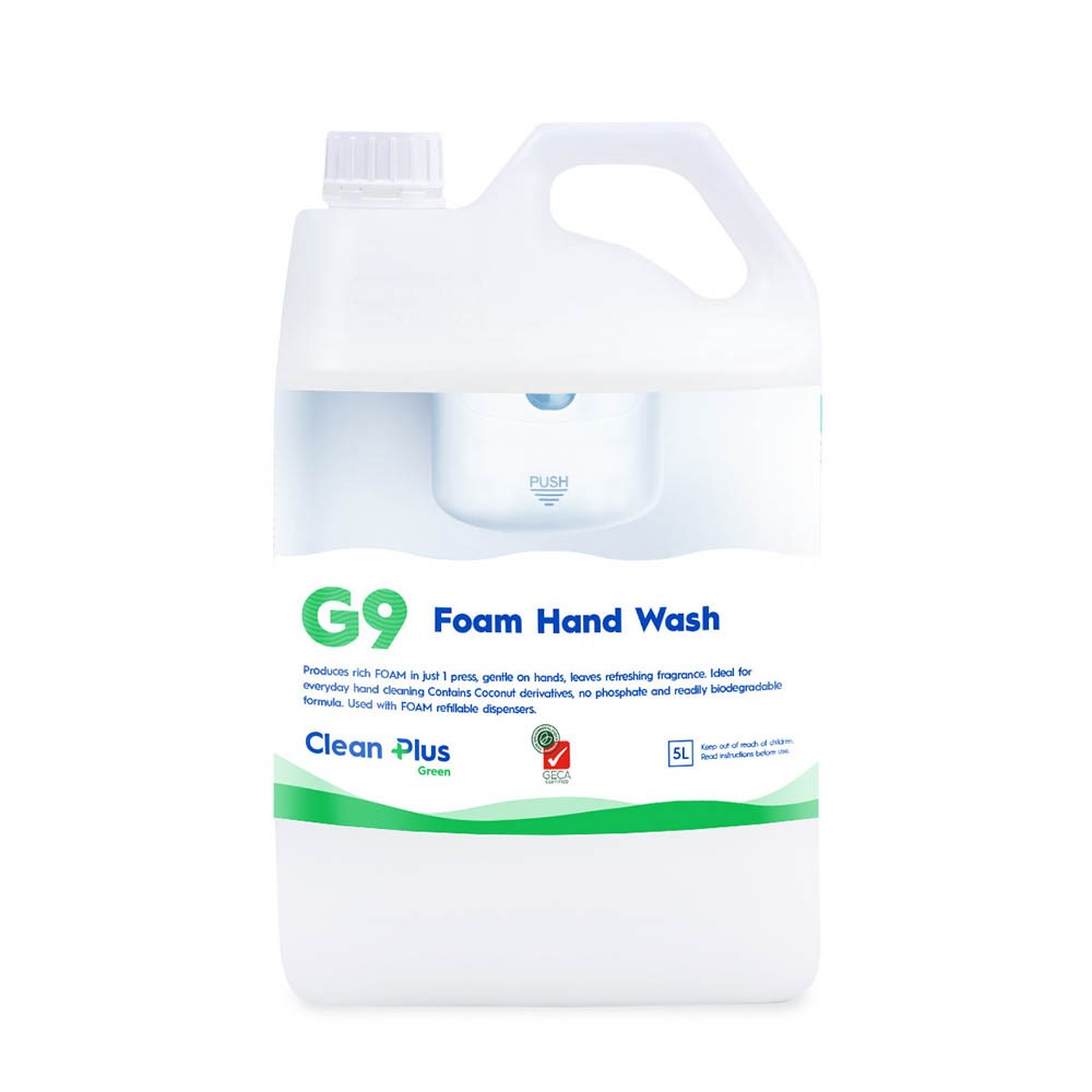 Foam hand wash with a pleasant fragrance. G9 is an environmentally responsible product which produces rich FOAM in just 1 press, is gentle on hands and leaves you feeling refreshed. GECA approved product biodegradable safe to be used on food preparation areas when used according to instructions provided. G9 is ideal for everyday use through our refillable dispensers.