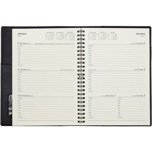 Ideal for those 'on the move' with its double wiro binding and heavily grained metallic and matt PU cover. Has a removable jacket sleeve, pen loop and internal storage pockets. Hourly appointment times. Monthly planners, staff leave and financial summary. 3 year calendars. Addresses and notes. Australian and New Zealand holidays. Current and forward year planners. Tax information.