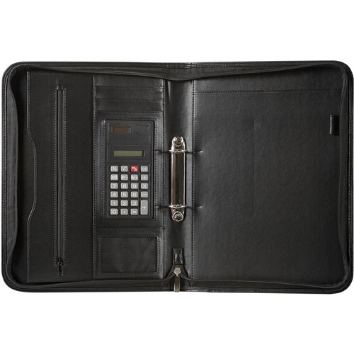 Portable and presentable compendium. Additional storage pockets and zippered compartments and A4 writing pad. Large business calculator. Business card pocket. Polyurethane. Dimensions: 270L x 50D x 345mmH.