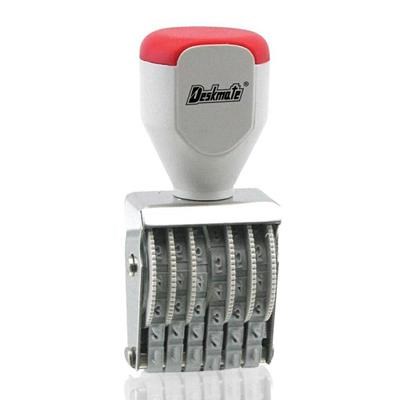 Features 6 bands. 4mm (max width 27mm) character height. Durable steel frame. Designed for use with Deskmate stamp pads. Ideal for pricing, invoicing, numbering etc. Stamp size: 34W x 29D x 77mmH.