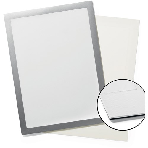 Perfect for presentation and organisation of information materials on textile surfaces. Quick insertion and exchange of documents via a fold-back magnetic frame. Works beautifully for trade shows and on bulletin boards. Quick attachment with innovative, full-frame, Microplast fastener on back for secure grip. Magnetic seal holds inserts securely in place.