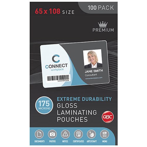 GBC LAMINATING POUCHES 65 X 108MM 175 MICRON GLOSS PACK OF 100