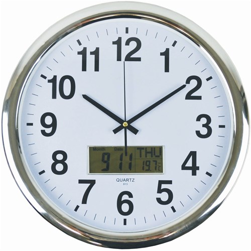 ITALPLAST WALL CLOCK INSET LCD DATE MONTH TEMPERATURE 43CM ROUND CHROME FRAME WHITE FACE