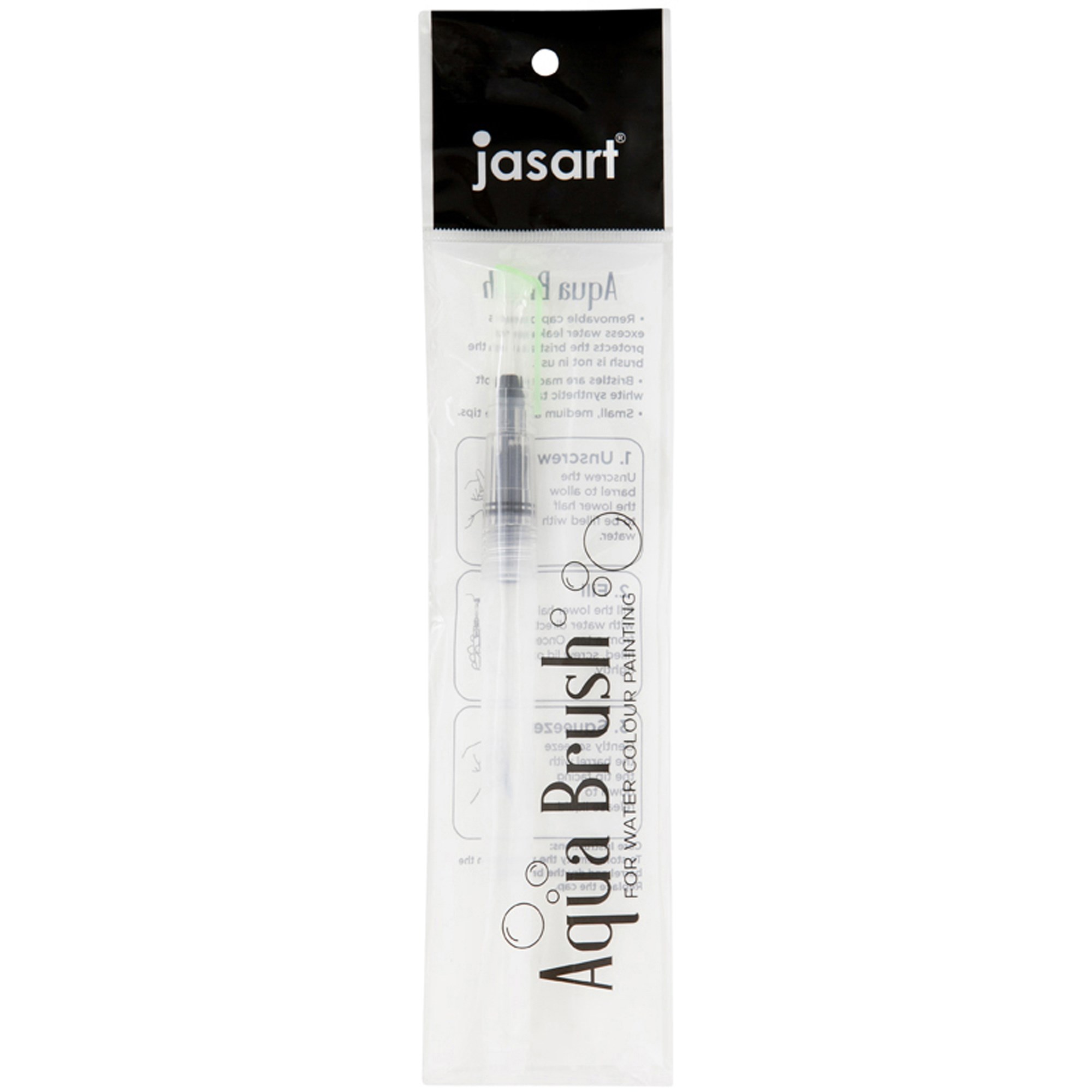 The Jasart Aqua Brush is a refillable multipurpose brush Fill with water to blend or with inks to create water colour effects Removable cap prevents excess water leakage and protects the brush when not in use Click close pen lid ensures an air tight closure Pocket clip on lid Hexagon handle for easy grip, also avoids the pen rolling away when not in use Clear barrel will show true colour if ink added Soft white synthetic bristles Available in Round Fine, Medium and Thick nibs and Flat Medium