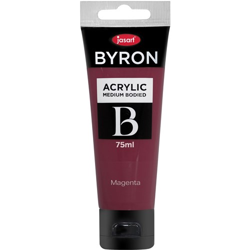 Jasart Byron is a medium bodied acrylic The colours are bright, intense and permanent after they have dried Can be used on most surfaces such as paper, canvas, wood, glass, plastic and more Warm and Cool Primary colours will allow you to have a superior colour mixing Non toxic 75ml tubes available in 30 colours including 4 fluoro colours and 2 metallic colours Each individual tube is foil sealed Also available in 1 Litre bottles in 23 colours including 2 metallic colours.