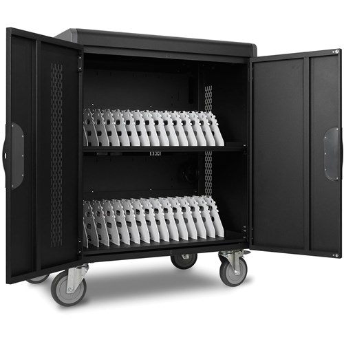 Neatly and easily charge, transport, lock, and store up to 32 devices up to 15.6 inches. Automatically prioritises power to the devices that need it most, for faster, more efficient charging. A security cable attachment ring provides a sturdy, secure point to attach a security cable (security cable and padlock not included). Built-in dividers and cable management organises devices and cables and keeps bulky adapters out of the way. 5 inch removable non-marking locking castors allow for easy movement over rough and uneven surfaces. A push handle makes transport simple. Lockable front and rear doors allow you to secure the devices inside (padlocks not included).