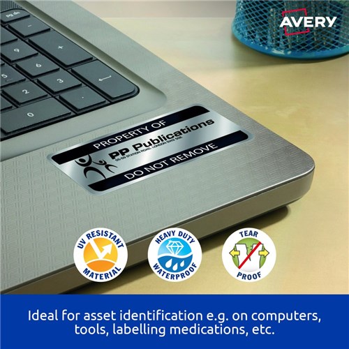 Engineered to take on tough applications where a standard label is not fit for purpose. Durable labels are tear proof, water, dirt, oil and UV resistant with permanent adhesive. Ideal for asset identification on computers, laptops, tablets, tools, labelling medications, samples and containers for use in refrigerators. Unaffected by temperature variations -40°C to +150°C. Customise your labels with Avery Design and Print, available at averyproducts.com.au/print. Size: 25.4mmx10mm 3780 labels, 20 sheets. 189 labels per sheet (189UP).