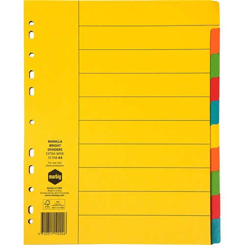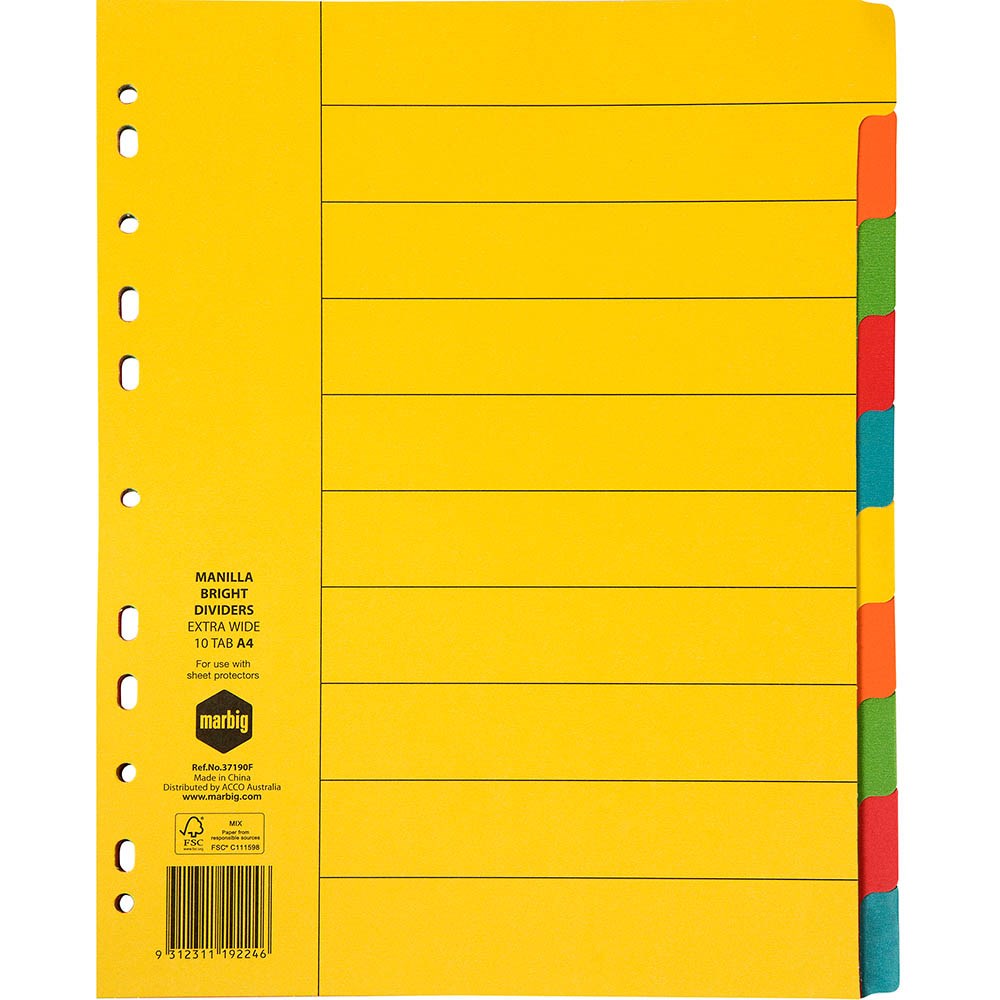 MARBIG MANILLA INDICES & DIVIDERS A4 EXTRA WIDE 10 TAB BRIGHT COLOURS