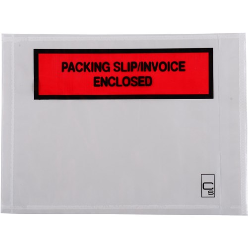 Superior grade adhesive and polyethylene prevent crinkling and sticking to itself. Standard size for packing slips. Black and red print \"Packing Slip/Invoice Enclosed\". White background. Top Layer 45 micron, bottom layer 35 micron, release paper 60gsm, adhesive 19-21gsm.