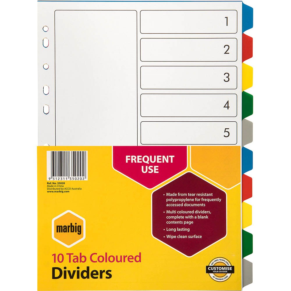 MARBIG PLASTIC INDICES & DIVIDERS A4 10 TAB MULTI COLOUR