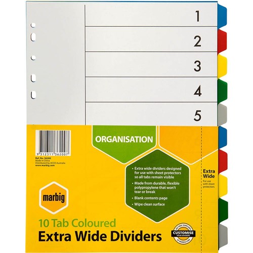 MARBIG PLASTIC INDICES & DIVIDERS A4 EXTRA WIDE 10 TAB MULTI COLOUR
