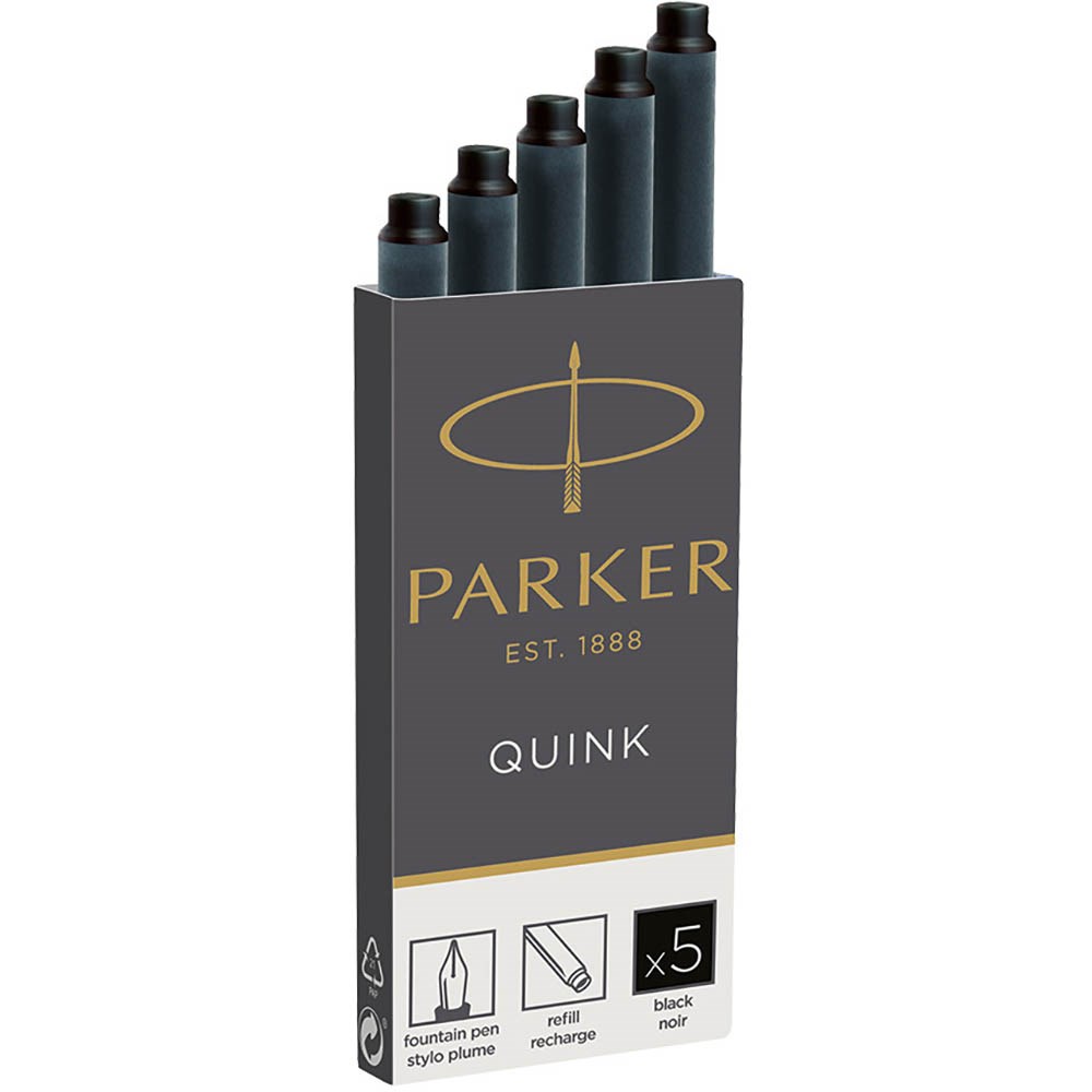 Ink refill cartridges designed exclusively for Parker Fountain pens. Convenient long cartridge keeps ink contained for effortless refilling. Richly pigmented ink makes a vivid impression on the page. Cartridge design allows you to easily use your fountain pen wherever you are. Includes 5 black ink refills.