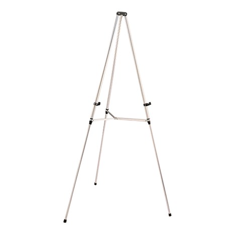 Portable, lightweight aluminium tripod easel features 19mm tubular legs that extend from 965-1675mm. Easy-to-use, twist-locking legs secure into position and locking cross-braces stabilise the easel. Complete with adjustable holders that support boards and presentation materials. Folds for storage. Adjustable display holders support up to 11Kgs display weight. Silver aluminium tripod frame. Legs extend and collapse to allow easy height adjustment.