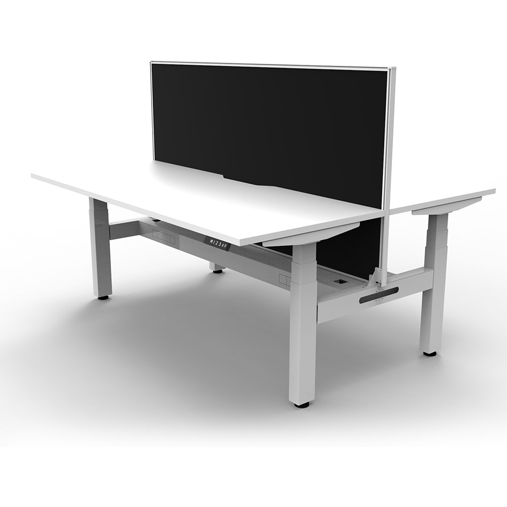 The entire Boost+ range has now been performance tested and is compliant to the AFRDI standards for general safety, strength, durability and stability in all sizes and configurations based on AS/NZS 4442:201. Unit Dimension: 1500mm W x 1500mm D x 1330mm H (Overall). Per User: 1500mm W x 750mm D. Desk Height: 620-1270mm H. Includes pinnable privacy screen in black fabric with matching white powder coated frame. 900mm H x 30mm T. Smooth and quiet adjustment at 38mm per second. Min Digital control panel with 3 pre-set positions, LED display panel, keypad safety lock and reminder alarm setting. Natural White coloured worksurface with 750mm depth top. 50mm D scallop cut out to rear. Back to Back Workstation with Screen and Cable Tray. Dual motor 3 stage motorised legs. 140kg weight loading capacity. 10 Year Manufacturer's Warranty. Delivery, installation and assembly charges may apply to furniture. Please enquire to confirm.