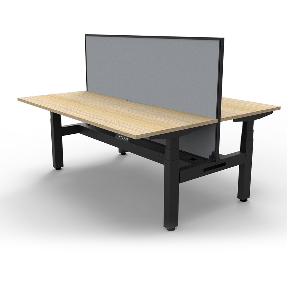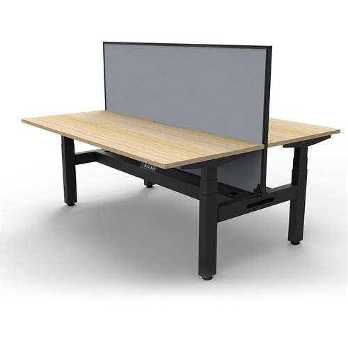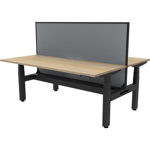 The entire Boost+ range has now been performance tested and is compliant to the AFRDI standards for general safety, strength, durability and stability in all sizes and configurations based on AS/NZS 4442:201. Unit Dimension: 1800mm W x 1500mm D x 1330mm H (Overall). Per User: 1800mm W x 750mm D. Desk Height: 620-1270mm H. Includes pinnable privacy screen in grey fabric with matching black powder coated frame. 900mm H x 30mm T. Smooth and quiet adjustment at 38mm per second. Min Digital control panel with 3 pre-set positions, LED display panel, keypad safety lock and reminder alarm setting. Natural Oak coloured worksurface with 750mm depth top. 50mm D scallop cut out to rear. Back to Back Workstation with Screen and Cable Tray. Dual motor 3 stage motorised legs. 140kg weight loading capacity. 10 Year Manufacturer's Warranty. Delivery, installation and assembly charges may apply to furniture. Please enquire to confirm.