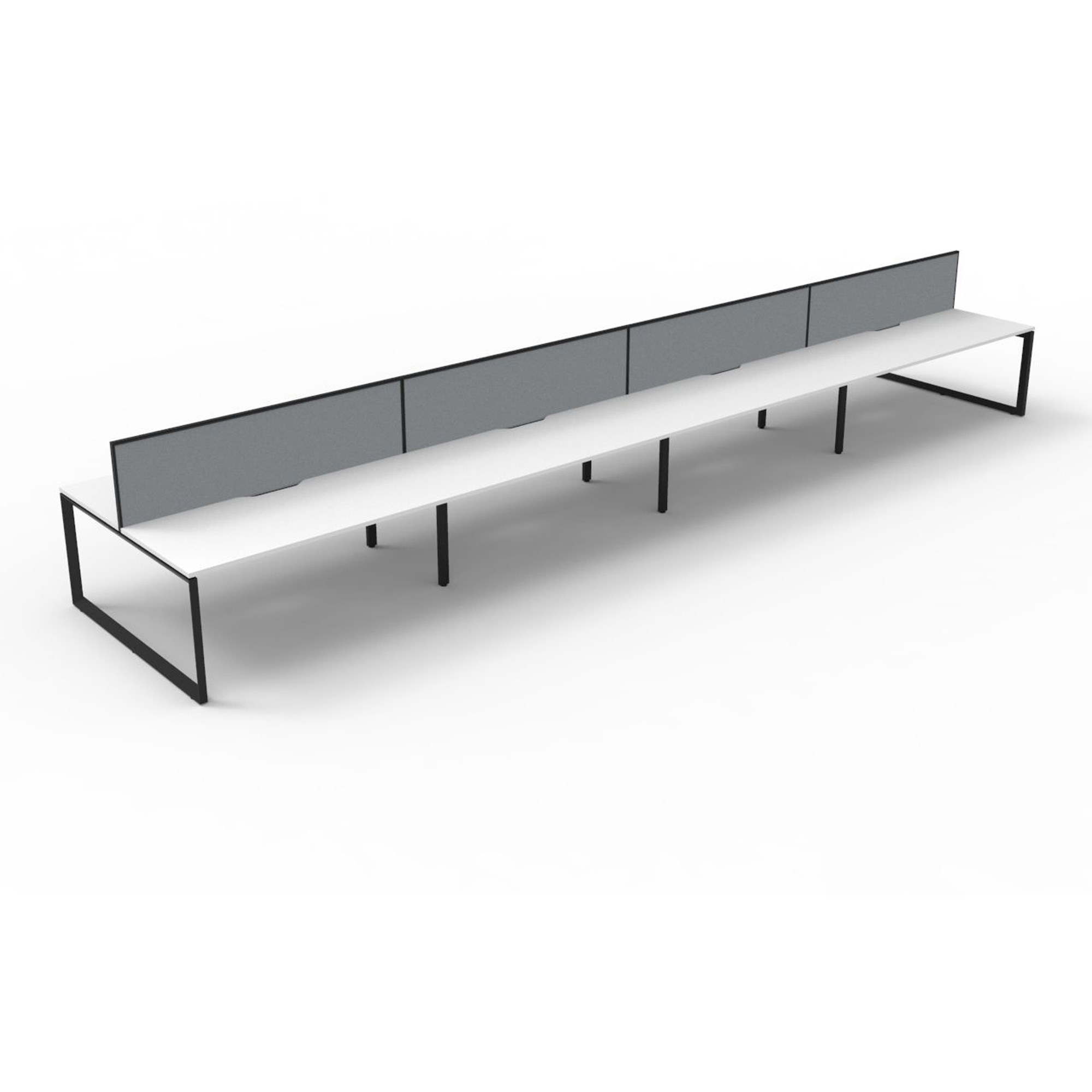 Maximise space and create an efficient working environment with Deluxe Rapid Infinity. With scallop for cable access, and a recessed leg to create full leg access in long runs of workstations. Overall Including Screen: 7200mm W x 1530mm D x 1200mm H. Per User: 1800mm W x 750mm D. Desk Height: 730mm. Includes pinnable privacy screen in grey fabric with matching black powder coated frame. 495mm H x 30mm T. With 410mm W x 50mm D Scallop Cable Access. 60mm x 45mm bevelled edge powder coated Loop Leg underframe. Recessed leg to create full leg access in long runs of workstations. Scalloped top for easy wire management. Double support rail for extra strength. Adjustable levelling feet. E0 Enviroboard. 5 Year Manufacturer's Warranty. Delivery, installation and assembly charges may apply to furniture. Please enquire to confirm.