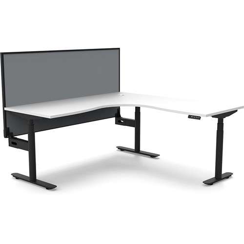 White top with Black frame. Unit Dimension: 1500/1500mm W x 750mm D x 1330mm H. 620-1270mm height range for desk. E0 rated top. Powdercoat base. Digital control panel with 3 pre-set positions, LED display panel, keypad safety lock & reminder alarm setting. Anti-collision technology, noise emission of less than 50DB. Lifting capacity of 120kg with a max speed of 38mm per second. 70mm diameter round column legs. 700mm wide foot size with adjustable leveling feet, return foot: 700mm. Comes with 30mm thick privacy screen. 10 Year Manufacturer's Warranty. Delivery, installation and assembly charges may apply to furniture. Please enquire to confirm.