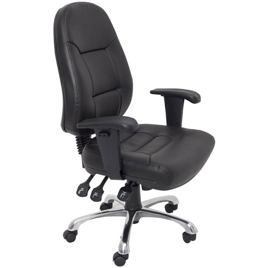 Executive operator chair with high back and adjustable arms. Comes standard with a range of adjustments, seat and back tilt, seat slide for extra seat depth, and ratchet back for easy back height adjustment. Chair Capacity: 130kg. Fully ergonomic Chrome base with adjustable arms and ratchet back. Seat slide. 3 levers. Composition: PU leather seat and back, chrome base. Chair Dimensions: Seat 540W x 450D x Back 580H x Seat 510-590mmH. Indicative Seating Time: 8 Hours. 10 Year Manufacturer's Warranty. Delivery, installation and assembly charges may apply to furniture. Please enquire to confirm.