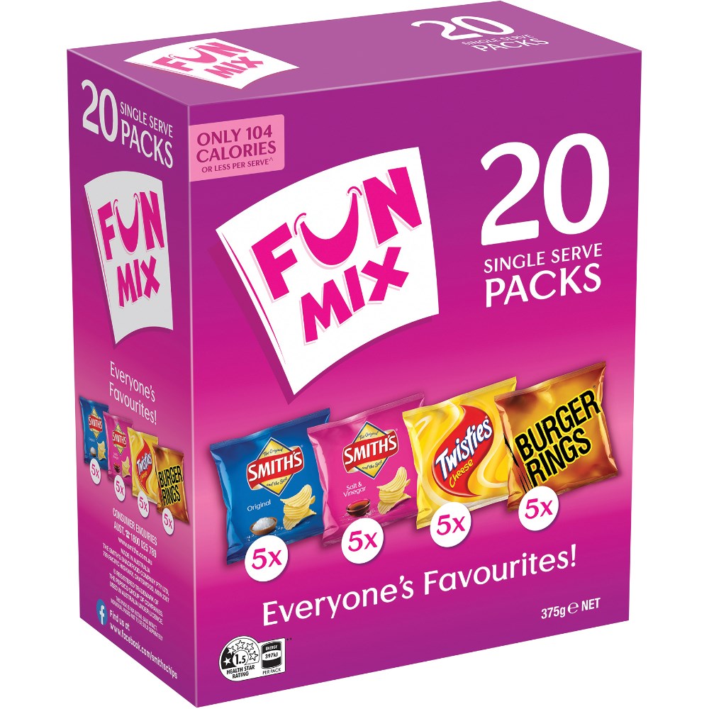 Full of the funniest of Smith's flavours. 5 x Original, 5 x Salt and Vinegar, 5 x Twisties and 5 x Burger Rings. Variety is the spice of life!.