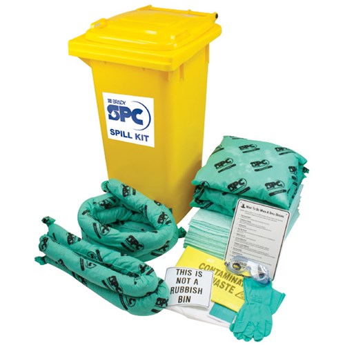 Complies to ISO 14001. Ideal for the clean-up of aggressive liquids and chemicals up to 120 litres. Suitable for virtually all chemical spills and will also absorb the general purpose, and oil only spill types also available. Comes in a handy weatherproof 120 litre bin. Use in lubricating and dispensing areas, loading bays, flammable goods stores. Hold centrally for emergency response. Kit contains: 3 socs (2 sizes), 50 pads, 3 pillows, 1 coveralls, 1 pair of gloves, 1 safety goggles, 3 disposal bags and 1 instructions for use. Refill packs available.