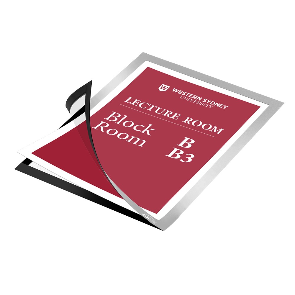 Clear display, grey frame, magnet snap closure. Peel off, re-stick, time after time. Overall Dimensions: 239 x 325mm. Display portrait or landscape.