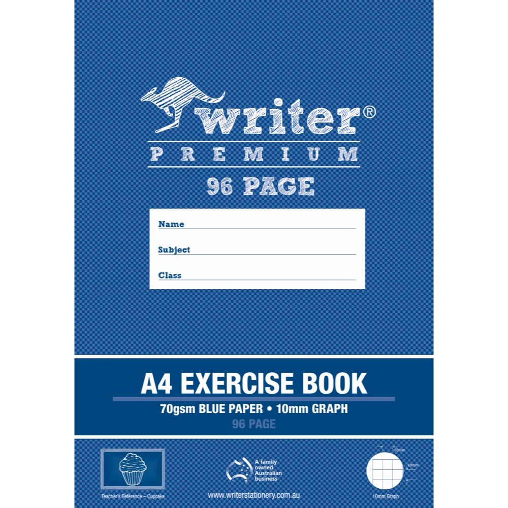 Writer Premium Exercise Books feature heavy duty covers, high quality white 70gsm paper. Blue paper. Teachers reference Cupcake.